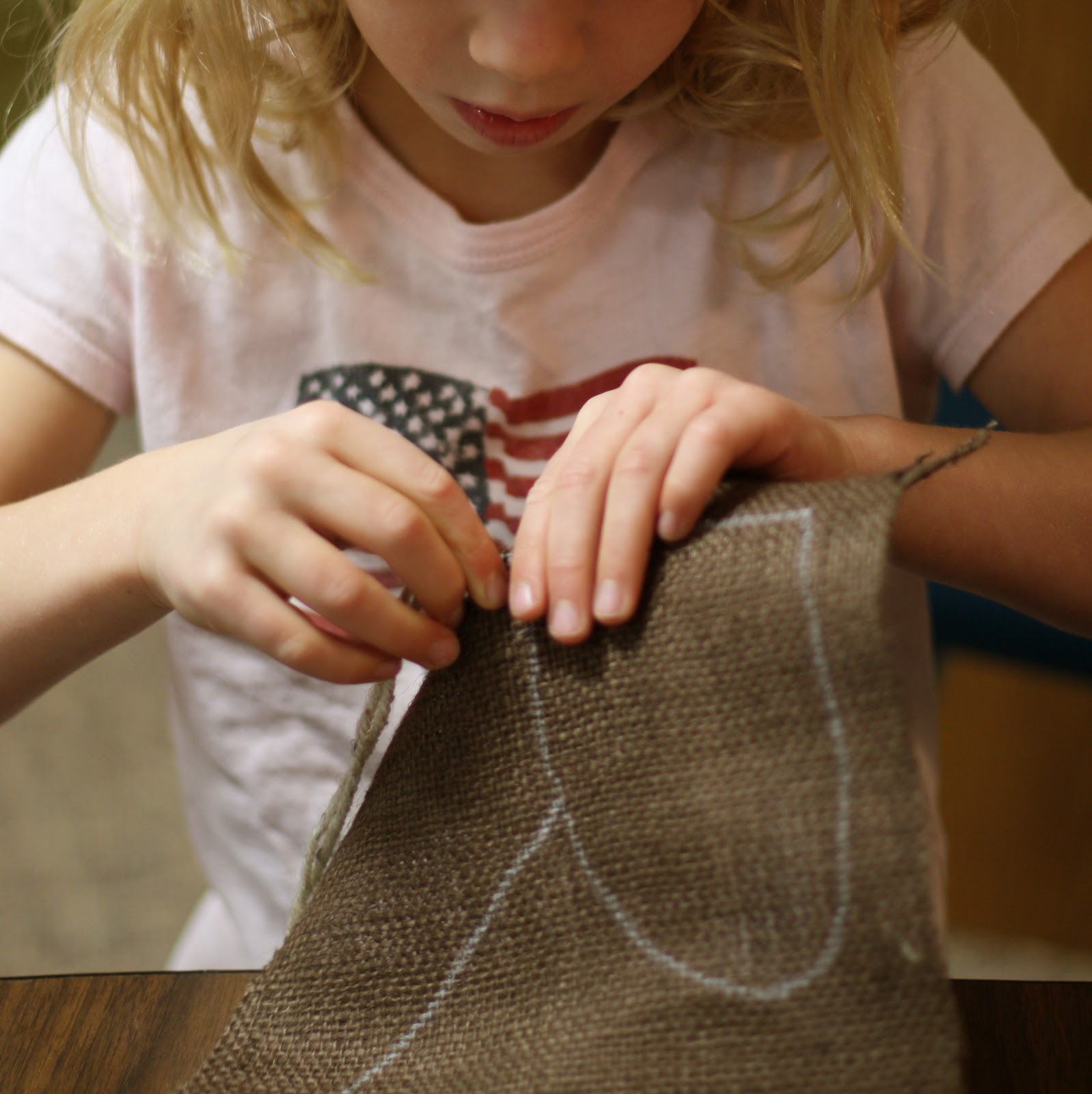 Let each child sew at their own level. Do not demand too much at this point. I like to engage the "love of the task" to build desire for future projects.