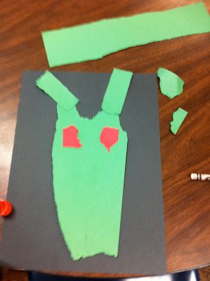 What you will need: A 9 x 12 black paper to build your alien on, a 9 x 12 green paper to tear the head of the alien out of, assorted colors of paper for facial features, black paint and a few items to print with.